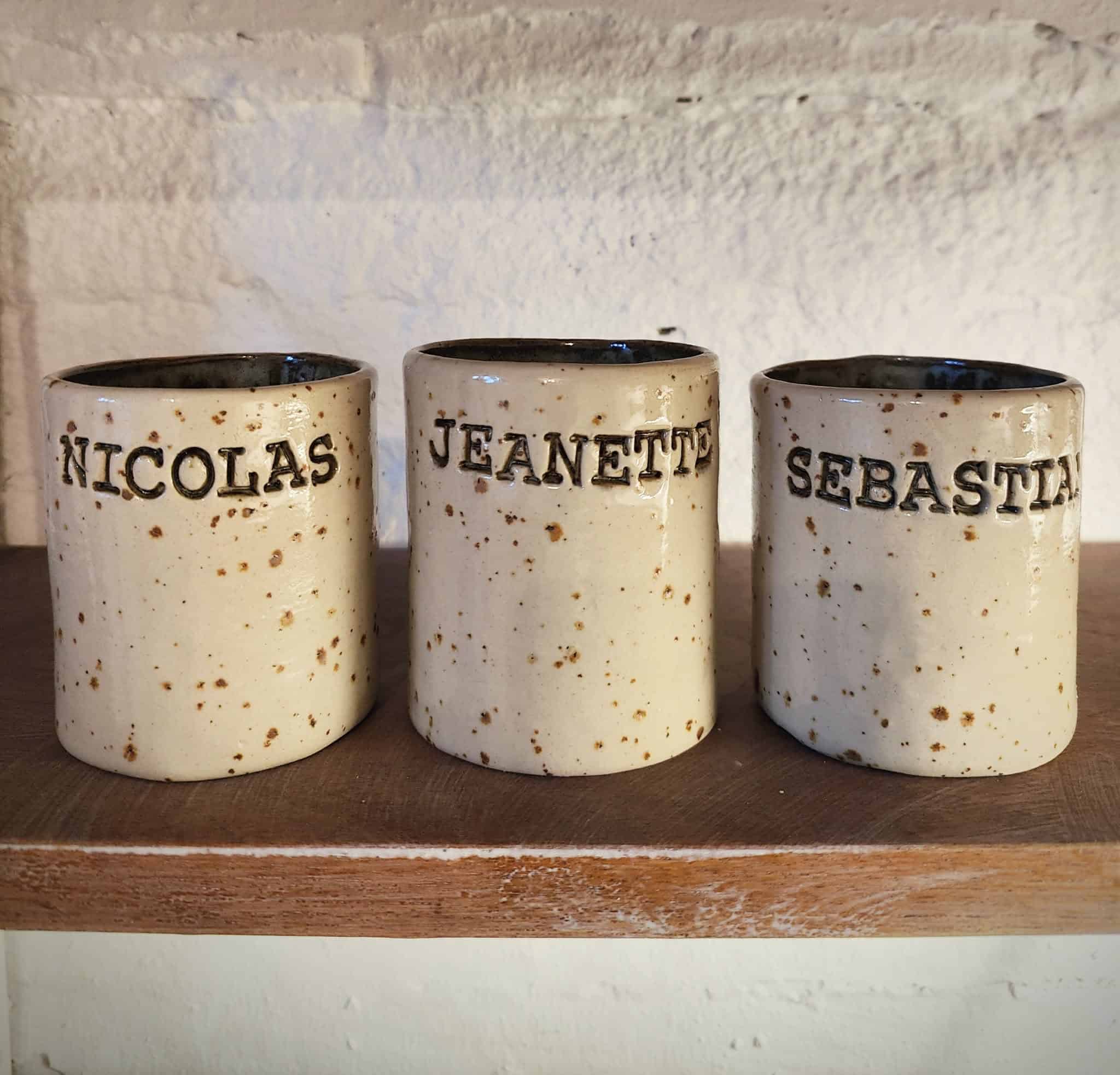 NAVNEKOPPEN er håndlavet i stentøjsler med lavapletter. Farven indvendig vil jeg vælge ud fra dine ønsker. Navnet vælger du selvfølgelig – der må godt være 2 navne – fx “far” på den ene side og “Thor” på den anden.