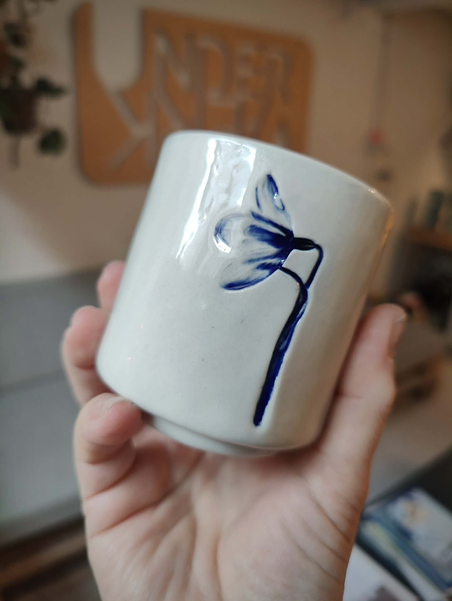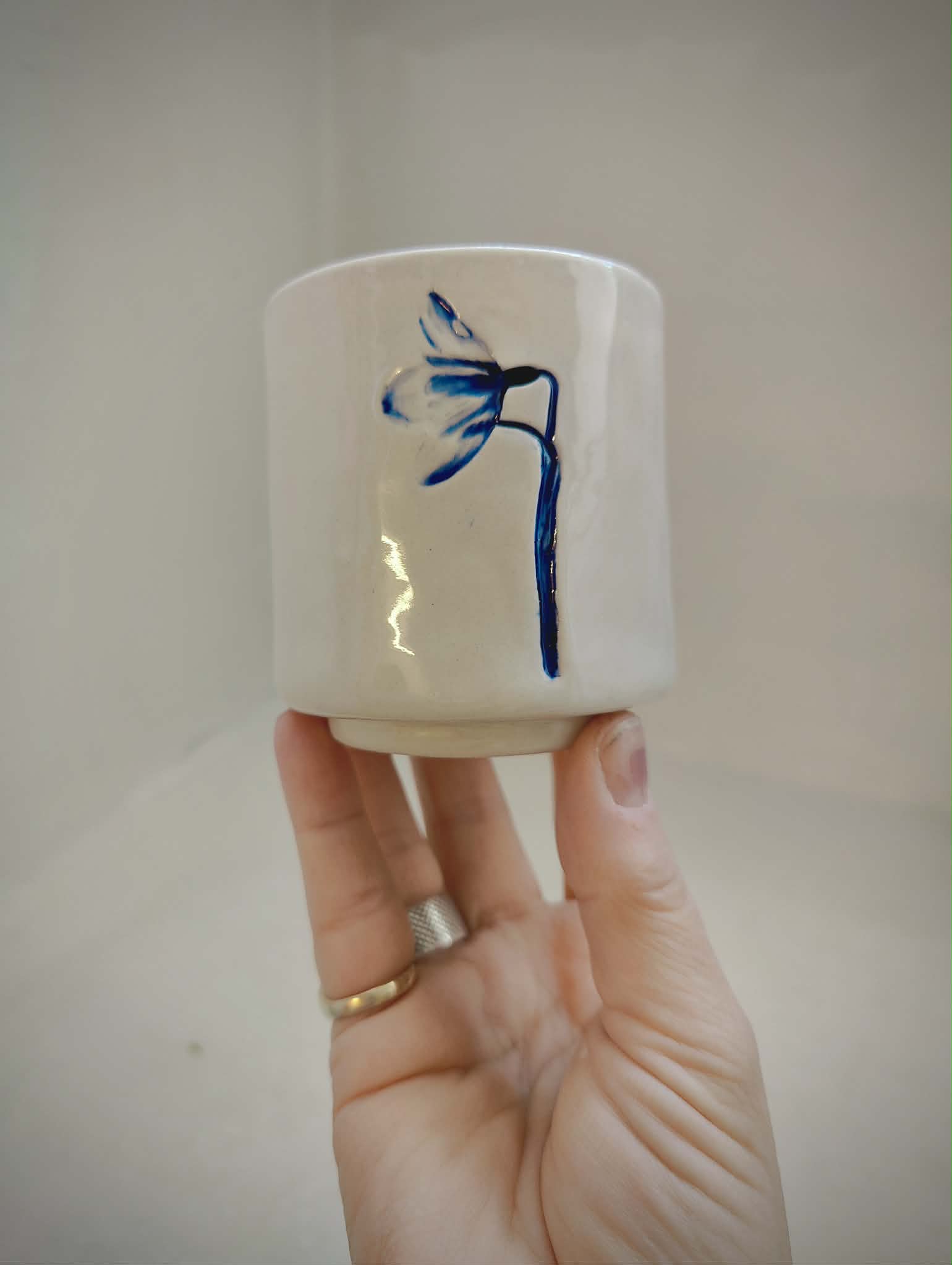 Denne håndbygget kop i porcelænsler, er en lille hyldest til forårets første tegn. Hver kop er dekoreret med tre forskellige vintergækker fra haven, trykt i leret og glaseret med en dyb blå, der fanger og fremhæver vintergækkens fine detaljer.